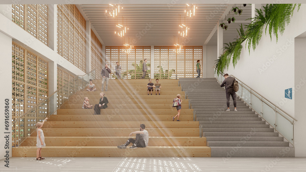 Tableau sur toile Library, multipurpose staircase, frontal render, natural lighting and ventilatio