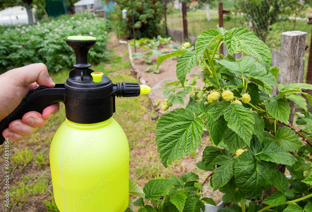 Tableau sur toile Spraying raspberries in the country with ammonia and blue vitriol to kill pests and parasites
