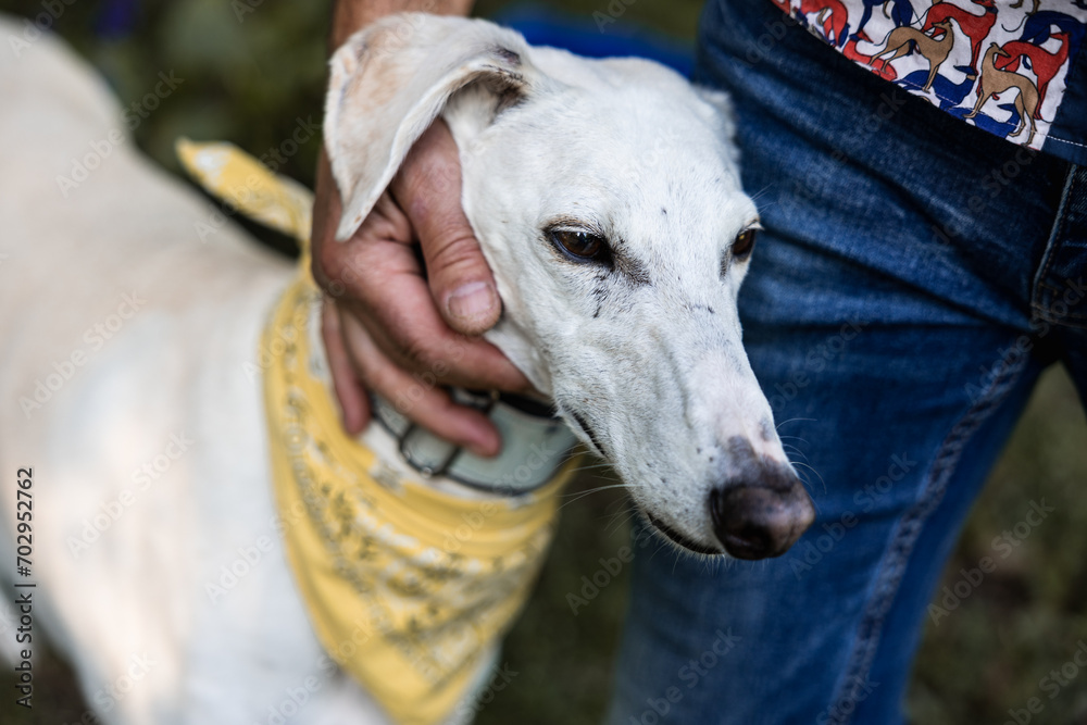 Tableau sur toile Close-up of a white greyhound being petted by his owner