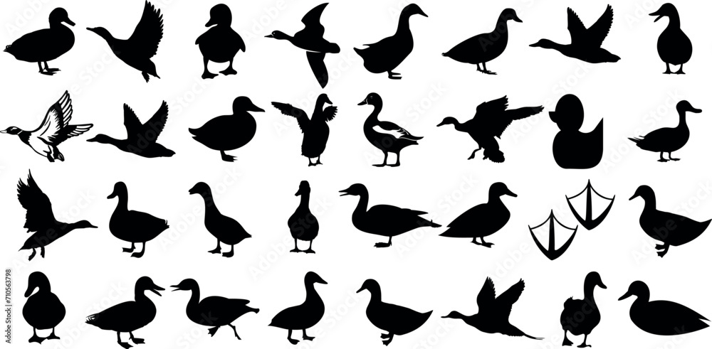 Tableau sur toile Duck silhouettes collection, flying and standing duck poses