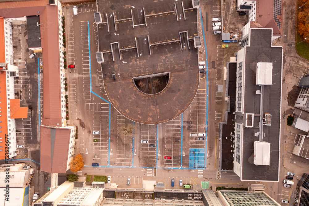 Tableau sur toile Drone photography of empty multistory parking lot during autumn sunset