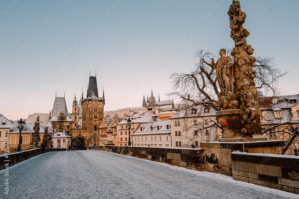 Tableau sur toile Snowy Charles Bridge in Prague in winter, no people, morning