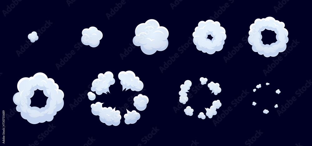 Smoke cloud explosion sprite or bomb blast effects for cartoon animation, vector puffs. Bomb explode or boom blast clouds of energy explosives and TNT dynamite pop explosion of burst for sprite sheet