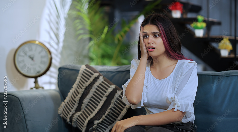 Tableau sur toile Indian tired tense abuse afraid young female girl sitting sofa couch watch bad T