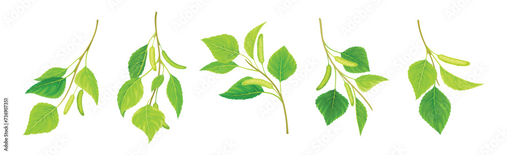 Tableau sur toile Green Birch Twigs with Catkins and Leaf on Stem Vector Set