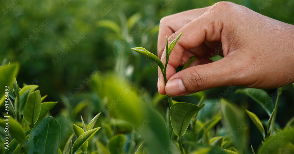 Tableau sur toile Woman Hand holding harvest plucking black green tea herbal agriculture