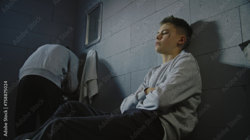 Tableau sur toile Upset Caucasian teenage prisoner sits on the bed in prison cell