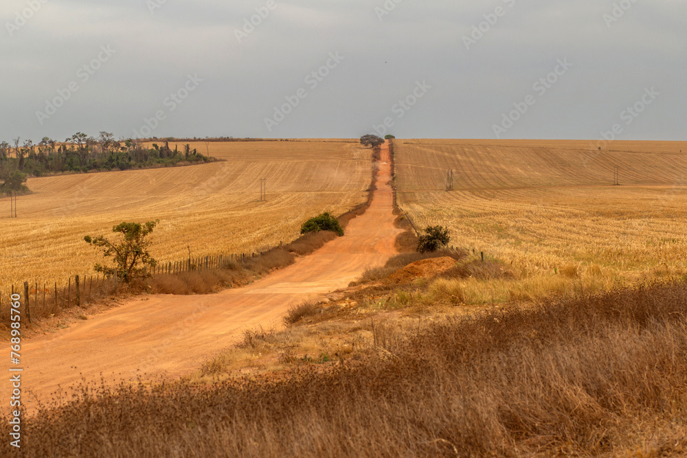 Tableau sur toile Uma estrada de terra em uma paisagem campestre em tempo de seca no cerrado goiano