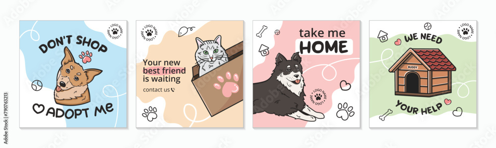 Tableau sur toile A set of cute templates for a social media post on the topic of dogs and cats adoption