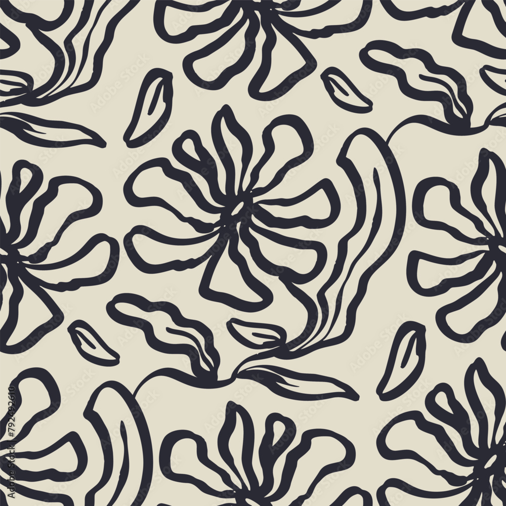 Tableau sur toile Monochrome black and white brush strokes inky flowers seamless pattern