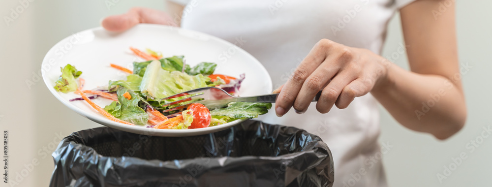 Tableau sur toile Compost from leftover food in the meal in household, female hand holding left over meal use fork scraping waste, rotten vegetable throwing away into garbage, trash or bin