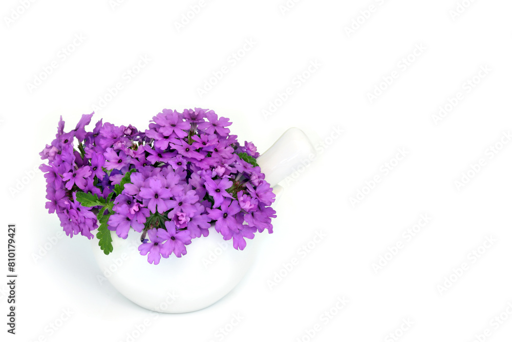 Tableau sur toile Verbena herb flowers in a mortar used in alternative herbal medicine as a sedative, treats insomnia, depression, arthritis, womens problems and heart conditions