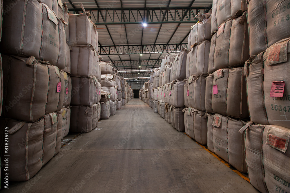 Tableau sur toile Grande armazém cheio até o teto de sacos cheios de café, Minas Gerais, Brasil