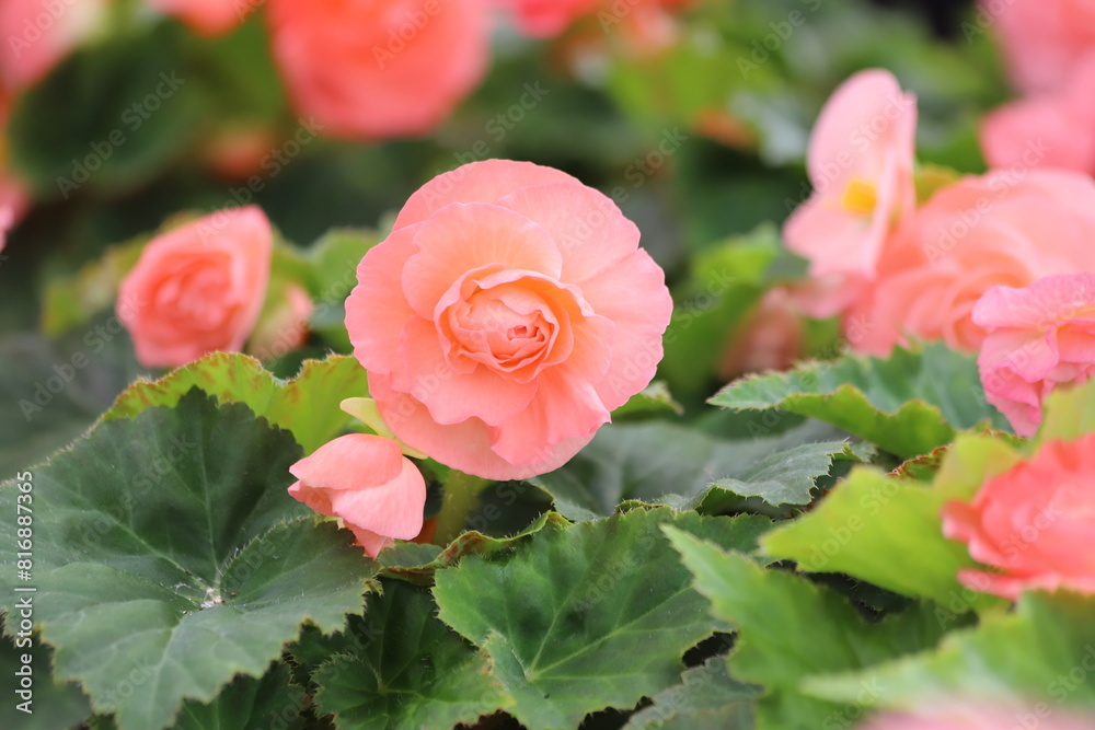Tableau sur toile Beautiful pink begonia flowers in garden. Close up.