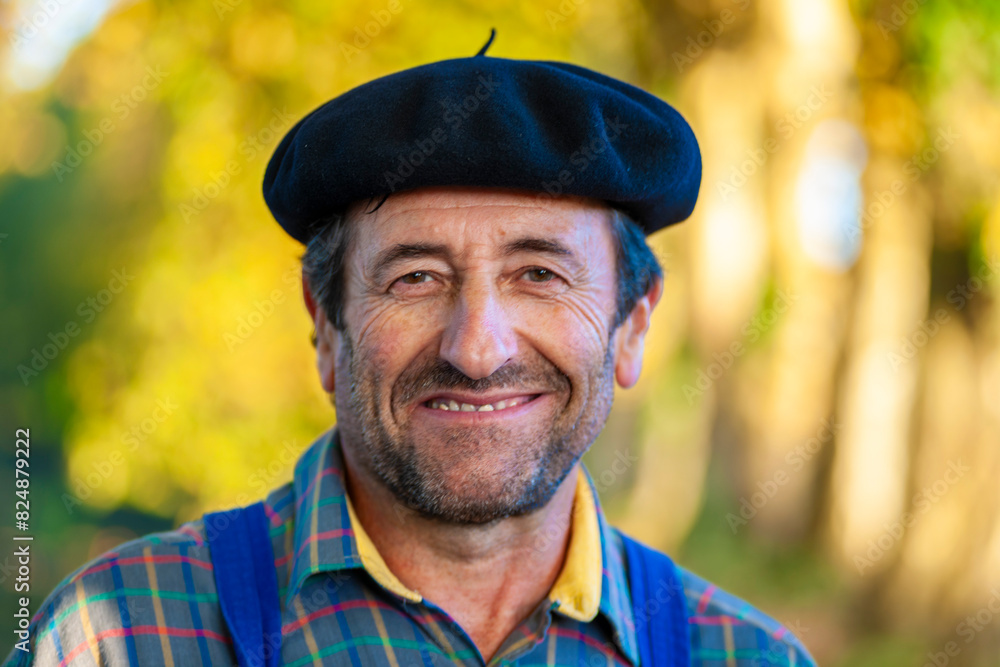 Tableau sur toile Portrait of a Frenchman, wearing a beret and blue dungarees smiling and gesticul