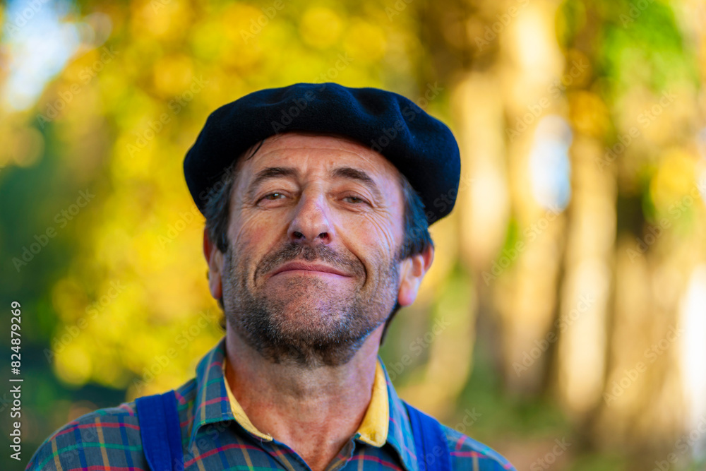 Tableau sur toile Portrait of a Frenchman, wearing a beret and blue dungarees smiling and gesticul