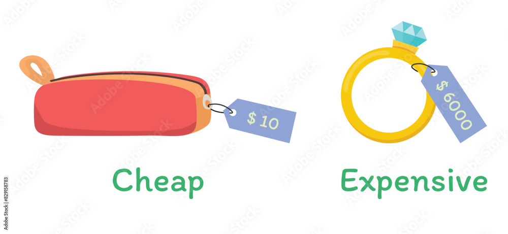 Tableau sur toile Opposite adjective antonym words expensive and cheap illustration of pencil case