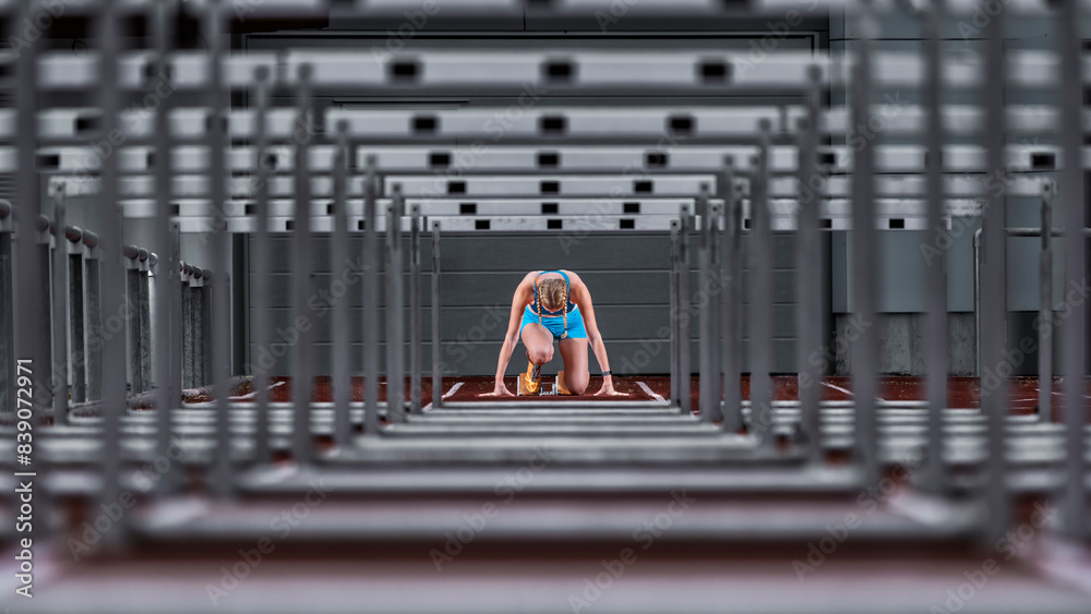 Tableau sur toile Germany, Baden Wurttemberg, Winterbach, Female hurdler right before sprint