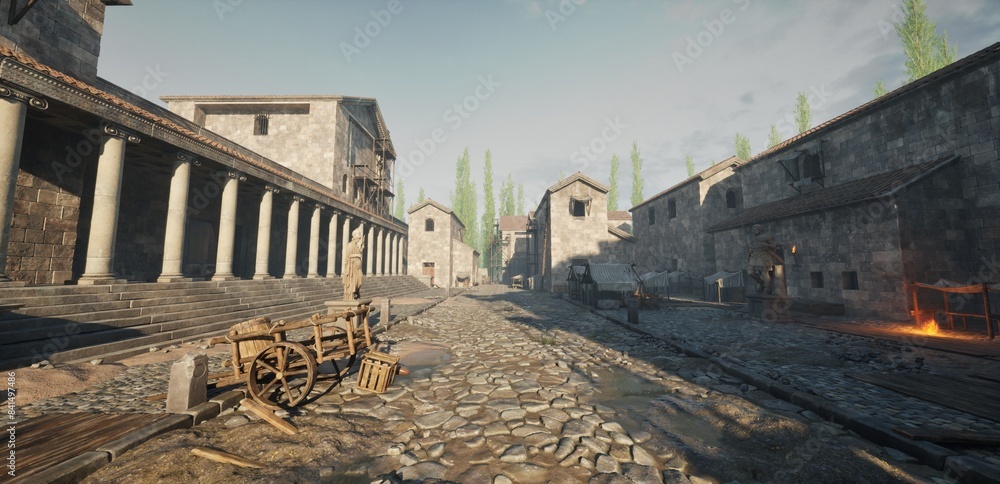 Tableau sur toile A 3D illustration of an ancient cobblestone street with classical architecture, featuring a wooden cart and antique statues