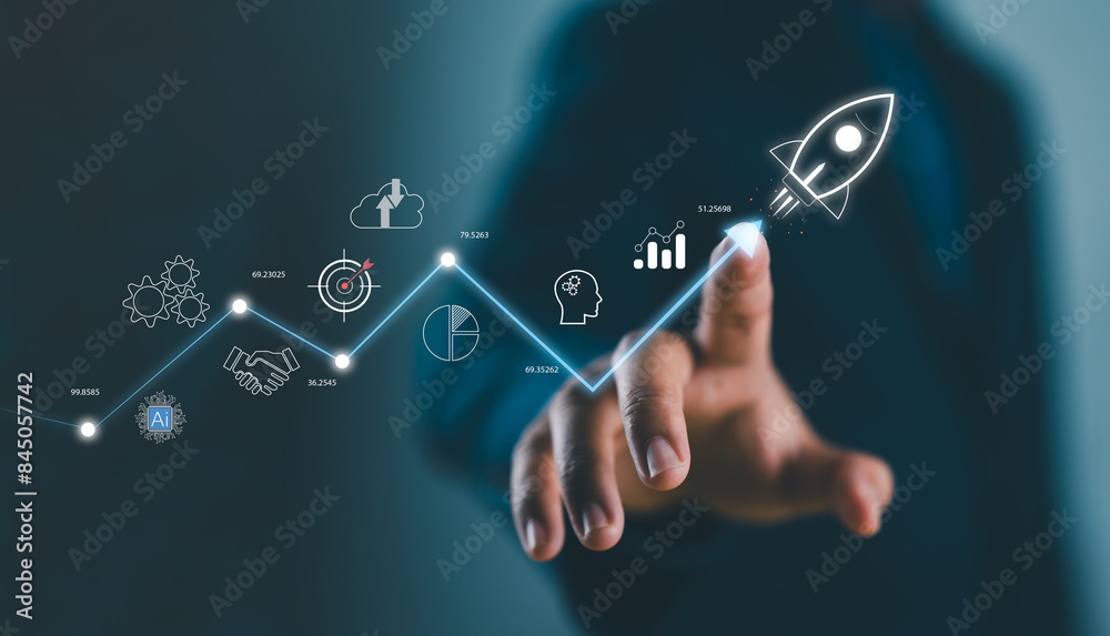 Tableau sur toile Businessman touch rocket launch investment growth, planning and starting corporate business start up aiming objective value development leadership and customer target group
