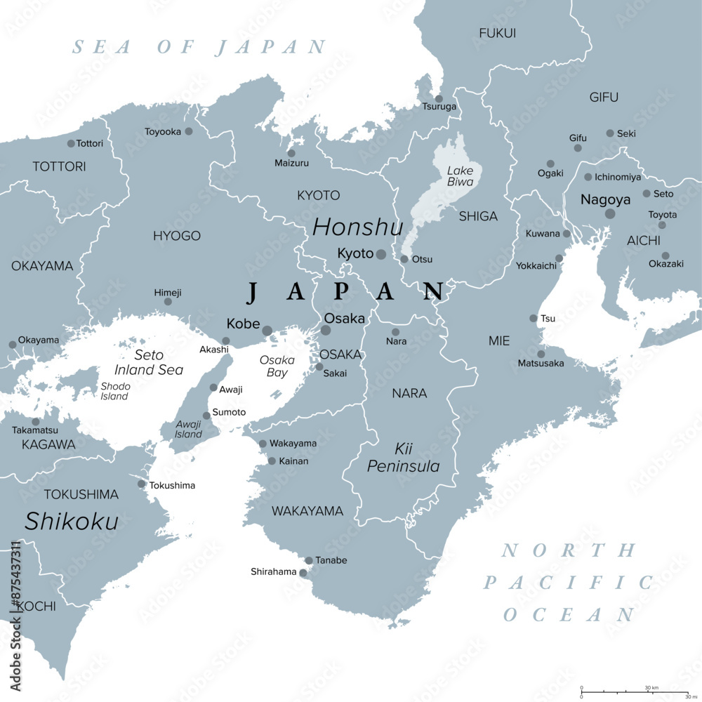 Tableau sur toile Kansai region, or the Kinki region in Japan, gray political map