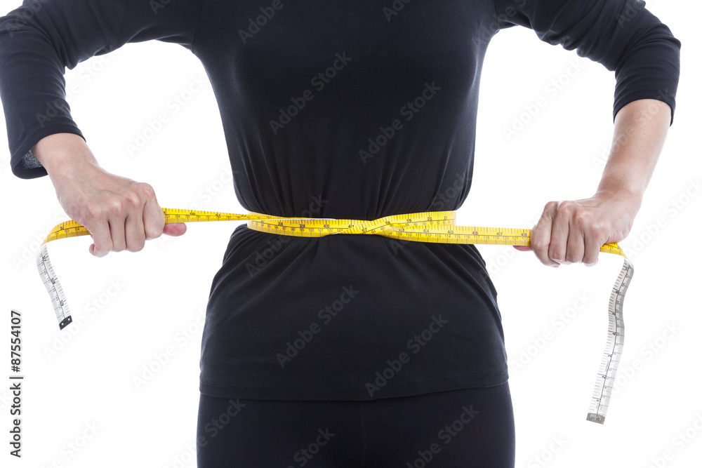 Tableau sur toile Weight loss concept, the woman in black tries to reduce her wais