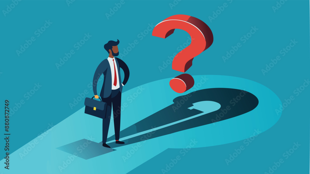 Tableau sur toile Questioning Life's Meaning: Curious Businessman Stares at Shadow Shaped as Quest