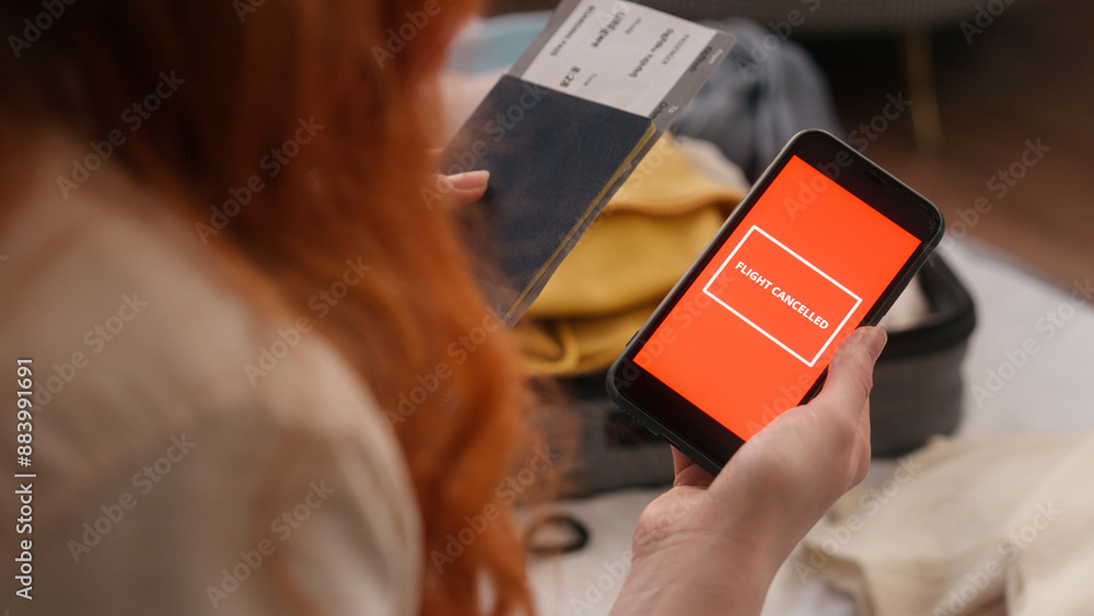 Tableau sur toile Sad unrecognizable woman at home angry holding phone cancel flight message delay