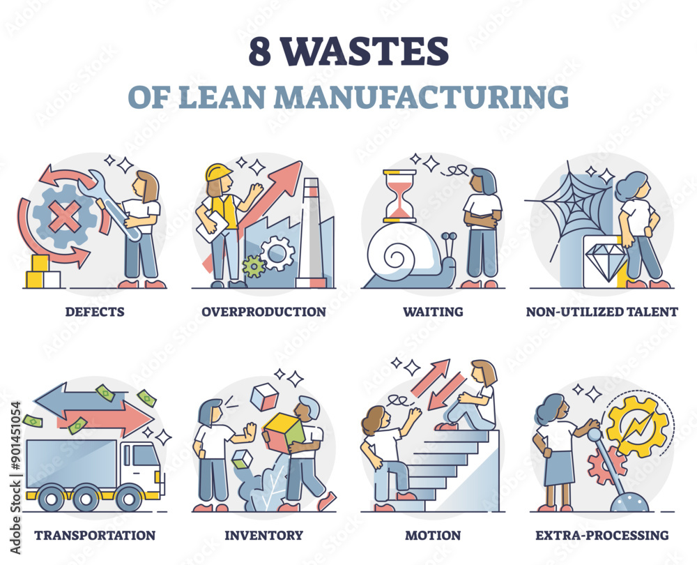 Tableau sur toile Eight wastes symptoms of lean manufacturing strategy outline collection set, transparent background