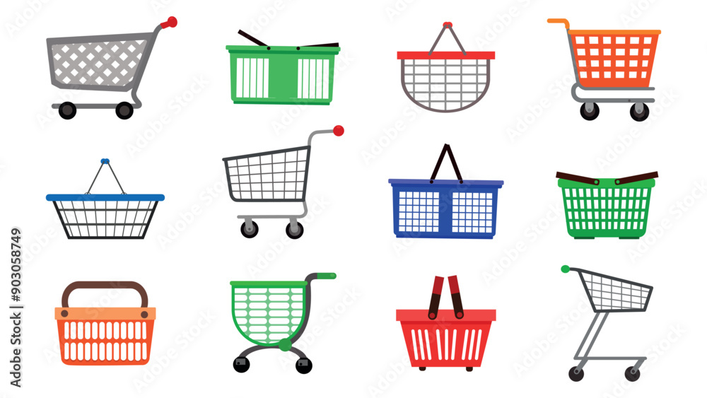 Tableau sur toile Set colorful, modern baskets and shopping carts in cartoon style
