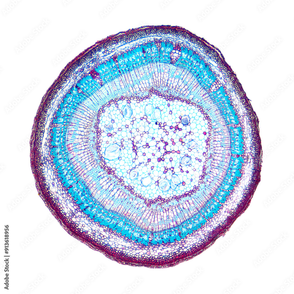 Tilia stem, cross section, 8X light micrograph. Stem of basswood, also known as linden, under the light microscope. Hematoxylin-eosin stained for better visualization. Isolated, over white, photo.