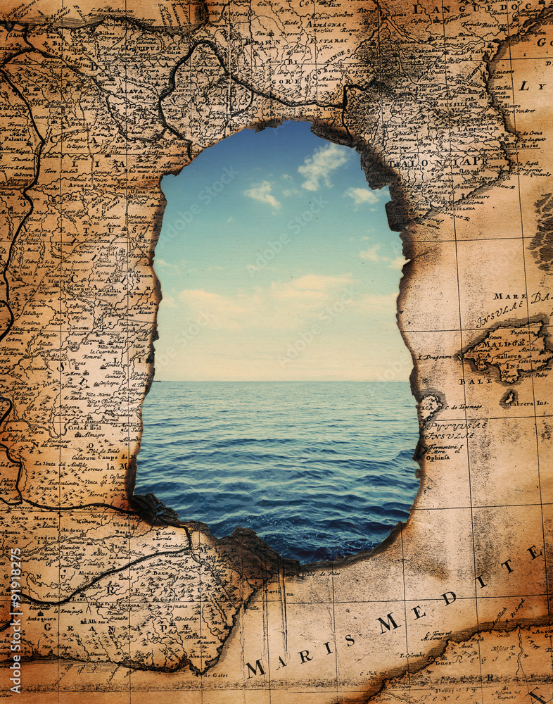 Tableau sur toile vintage burned-down map opens a view of the sea