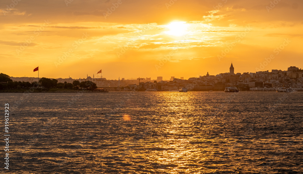 Tableau sur toile The sun sets over the Bosphorus, casting a golden glow on Istanbul's skyline