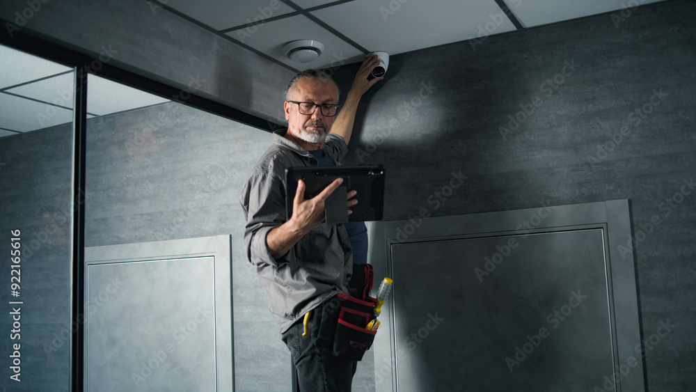 Tableau sur toile Male installer adjusts the angle of CCTV camera in office, sets up it using digital tablet computer with professional program
