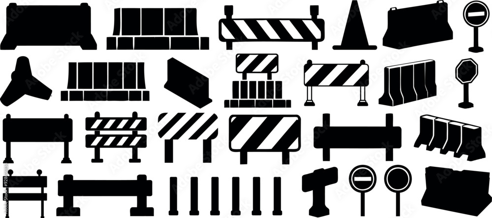 Tableau sur toile Traffic barrier, safety cone, road sign, and barricade icon in silhouette
