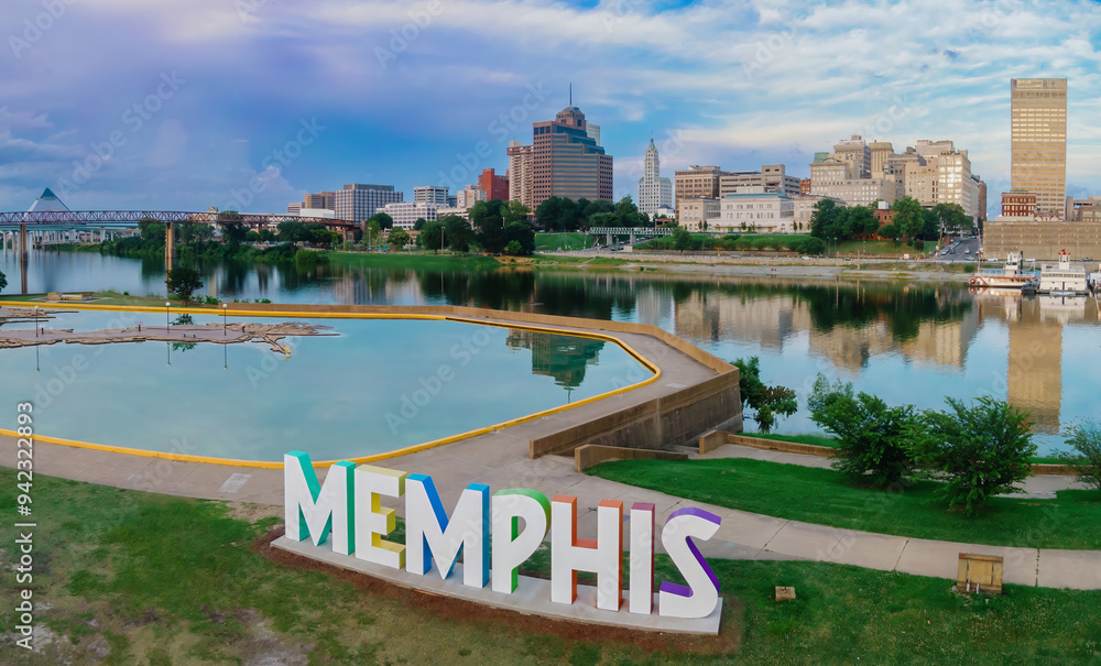 Tableau sur toile The Memphis Sign on Mud Island, and downtown Memphis, Tennessee, United States of America