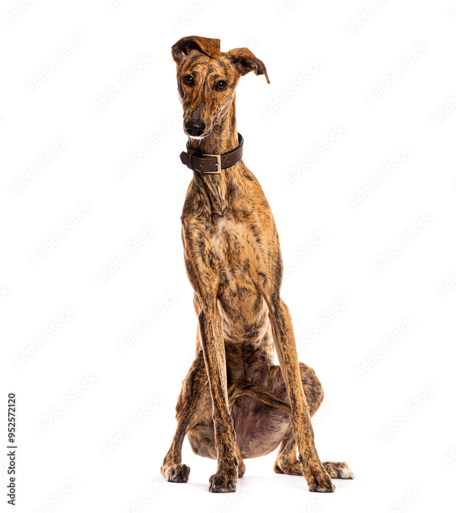 Tableau sur toile Brindle greyhound dog with brown leather collar sitting on white background