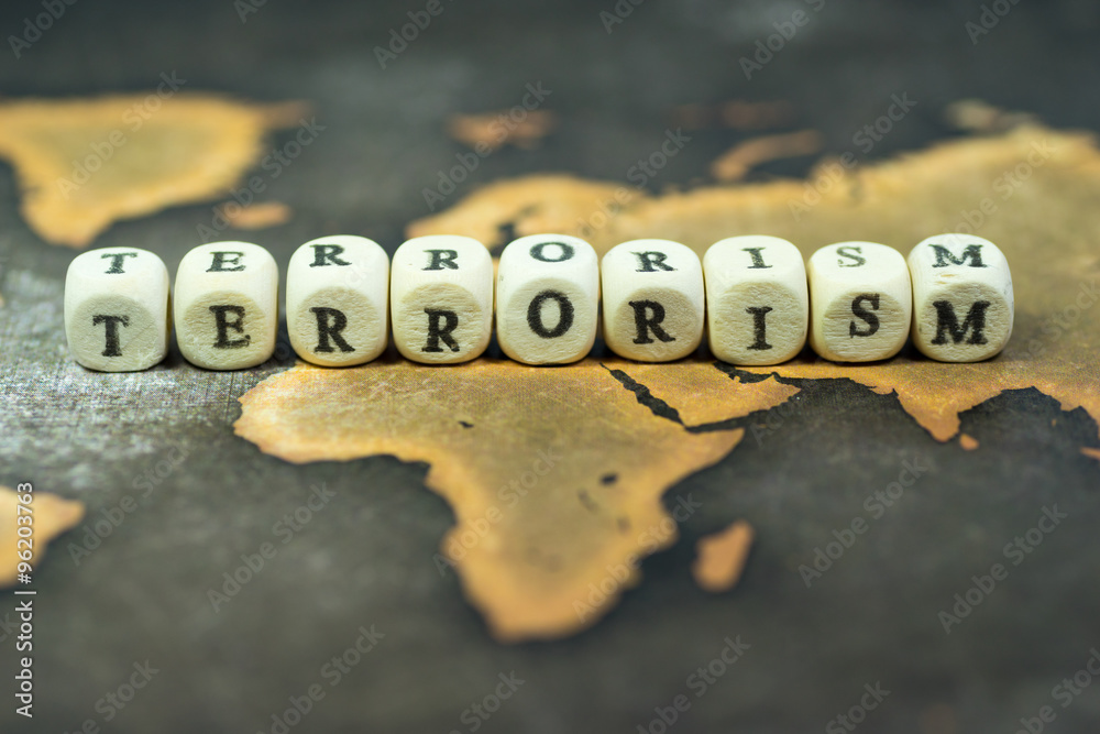 Tableau sur toile Wooden blocks with the text, TERRORISM, on the background of world map