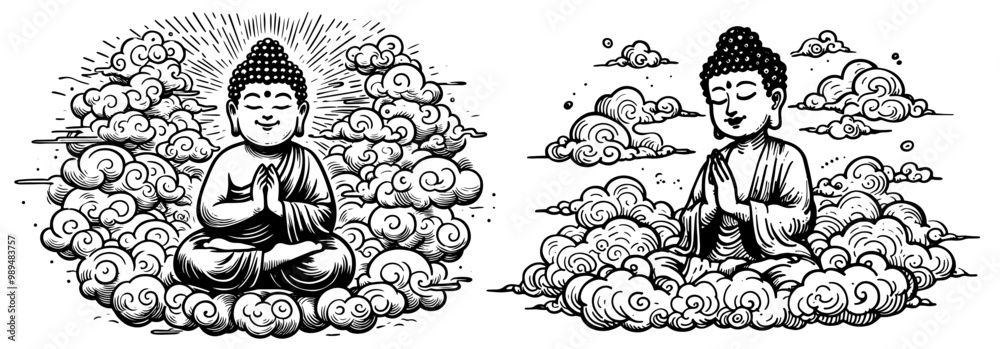 Tableau sur toile meditating buddha in clouds collection in black and white vector style