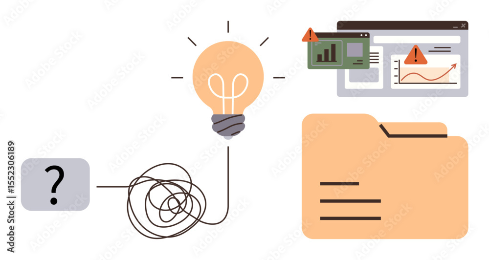 Photos Tangled line leading to a light bulb symbolizing problem-solving and innovation, surrounded by analytics, alerts, folder, and question mark suggesting complexity and organization