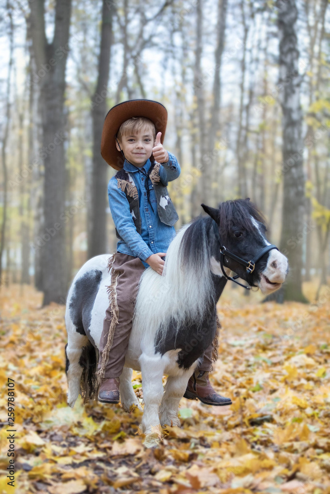 Tableau sur toile The boy in a suit of the cowboy sits astride a tiny pony in the park in the fall