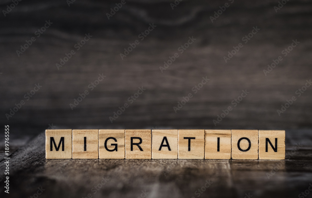 the word migration is made of bright wood cubes with black letters on a dark wooden background