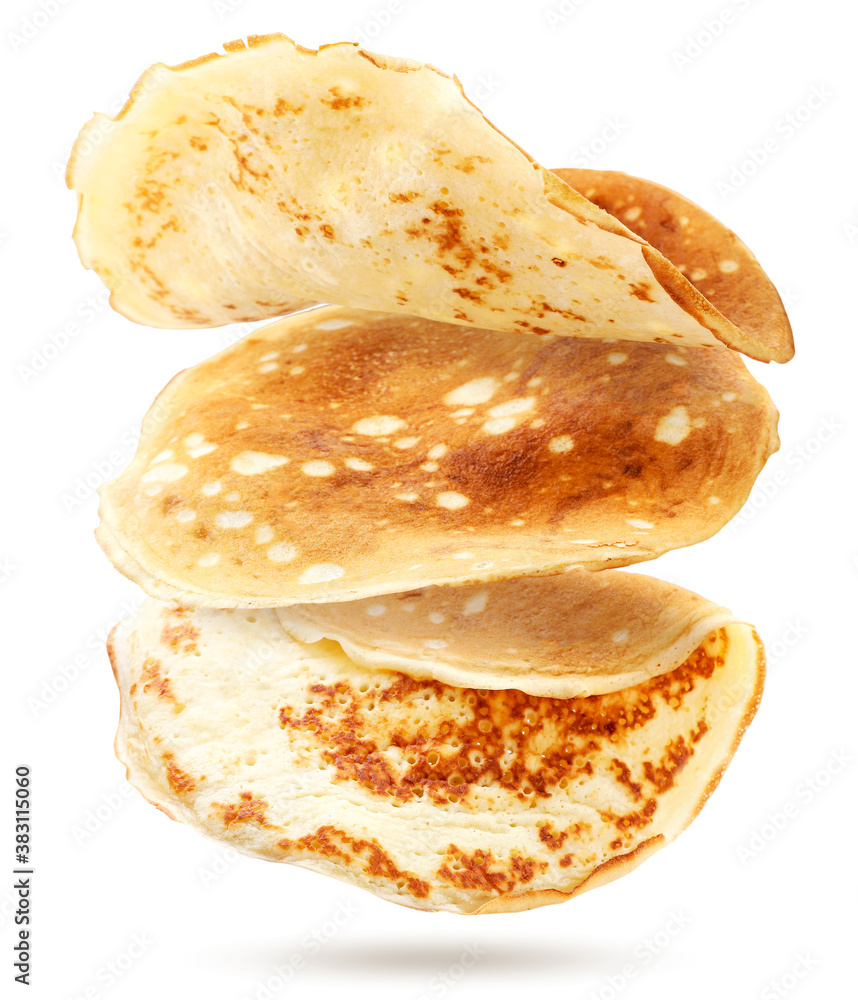 Tableau sur toile Thin pancakes are flying on a white background. Isolated