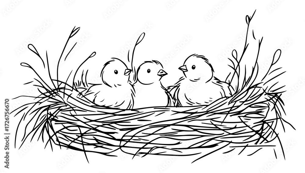 Tableau sur toile Three baby birds chirping eagerly in twig nest – cute springtime avian sketch il