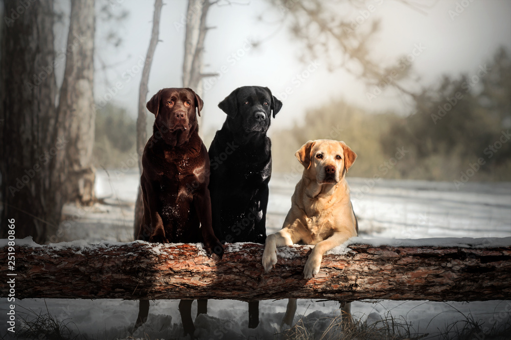 Photos three labrador retriever dogs of different colors walking in a snowy forest bea
