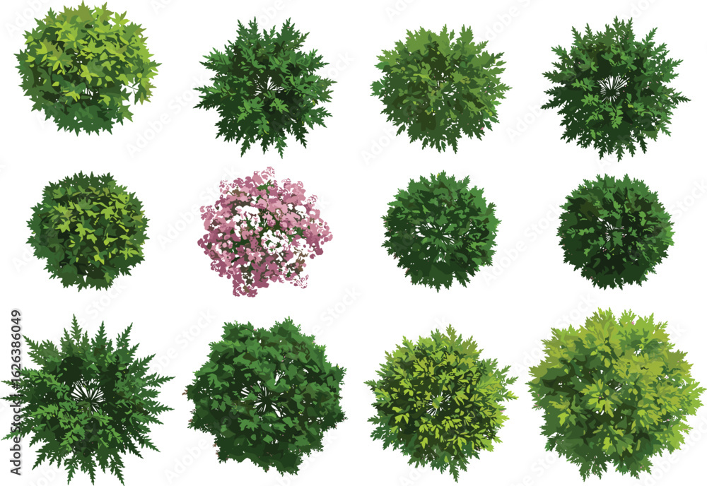 Photos Top view of green and blooming trees collection, isolated tree canopies for land