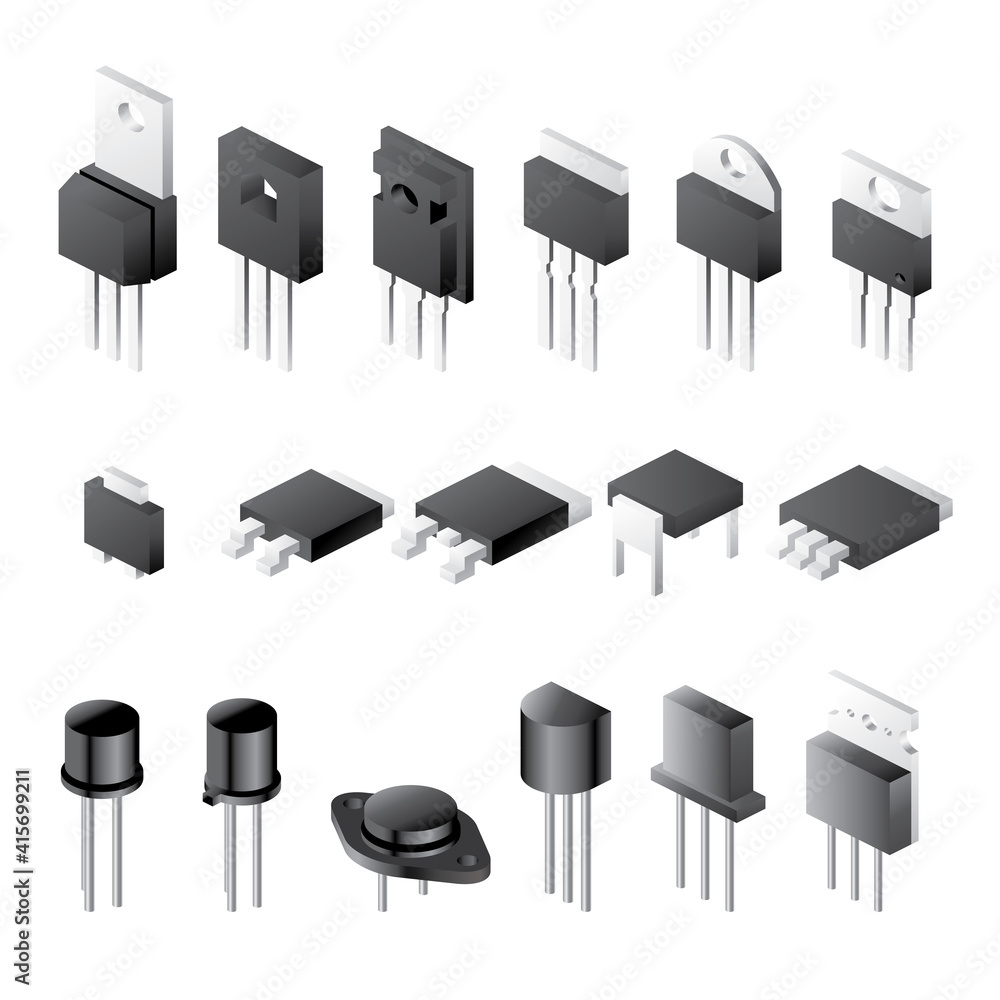Transistors Set Isolated on White Background. Isometric Power Electronic Components.