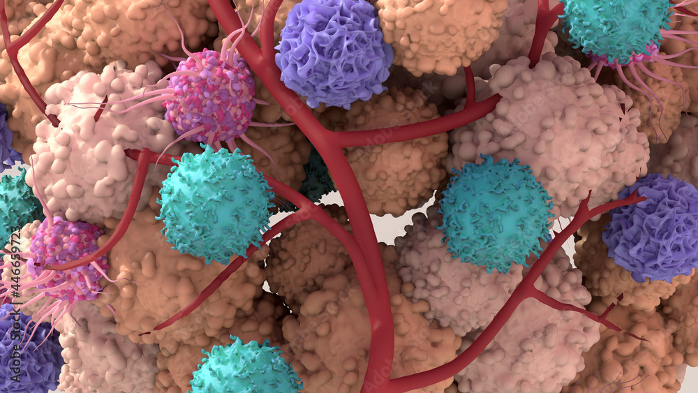 Tableau sur toile Tumor microenvironment, normal cells, molecules, and blood vessels that surround and feed a tumor cell