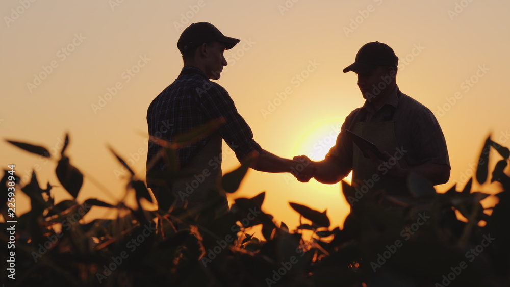 Tableau sur toile Two farmers talk on the field, then shake hands. Use a tablet