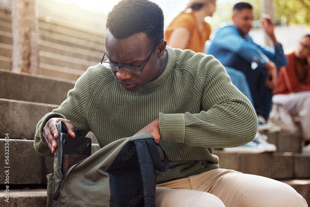 Photos University, student and black man looking in bag at campus for learning, studying or lost knowledge book